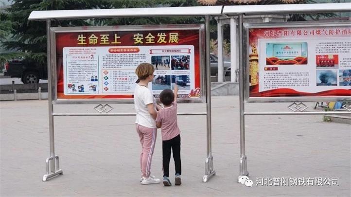 爸爸和女兒一起看普陽的安全展板。